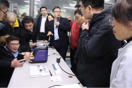 隨后,考察團(tuán)一行移步至公司三樓Cube100S產(chǎn)品生產(chǎn)線。針對(duì)炭黑行業(yè)的關(guān)鍵檢測(cè)需求,天瑞技術(shù)專(zhuān)家在現(xiàn)場(chǎng)對(duì)Cube100S能量色散X熒光光譜儀、EDX3300SPLUS 側(cè)照式單波長(zhǎng)X熒光光譜儀兩款儀器進(jìn)行了專(zhuān)場(chǎng)講解與實(shí)機(jī)演示,儀器表現(xiàn)出的高精度與高穩(wěn)定性,給專(zhuān)家領(lǐng)導(dǎo)們留下了深刻印象。他們不時(shí)駐足,就儀器的檢測(cè)原理、技術(shù)參數(shù)與天瑞工程師進(jìn)行深入交流。