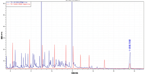 樣品TIC圖(藍(lán)色)與多溴聯(lián)苯醚混標(biāo)TIC圖(紅色)