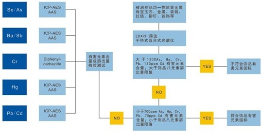 另外XRF由于只是測試元素的總含量,而無法進(jìn)行溶出量的檢測,我們可以通過XRF測試元素總量是否超過了溶出量最大限量,如果超過溶出量最大限量,則必須通過其他光譜分析檢測設(shè)備(如ICP、AAS)來確定元素的溶出量是否超過了最大限量,所以如果要全方位的解決飾品中有害元素檢測解決方案,單只靠XRF是無法全部做到的,還要進(jìn)行其它分析測試,下圖表示XRF檢測飾品有害元素的篩選性初檢分析方法: