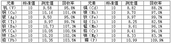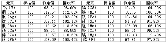 采用本方法測試潤滑油金屬含量光譜分析標準物質(zhì)GBW(E)130129、GBW(E)130132,對比實際測定值與標準值,得出實際測試的回收率,得到準確度數(shù)據(jù),結(jié)果見下表
