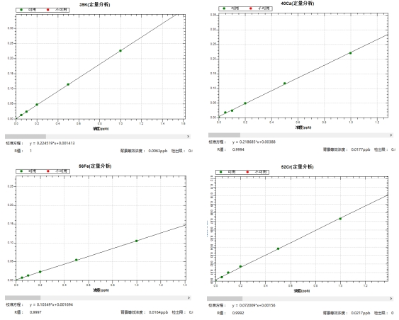 冷焰模式下,繪制各元素0,0.05,0.1,0.2,0.5,1.0μg/L系列濃度標(biāo)液工作曲線,39K、40Ca、56Fe等同位素的線性相關(guān)系數(shù)r均大于0.999,背景等效濃度為0.0023μg/L~0.0217μg/L。