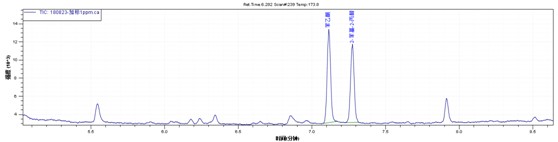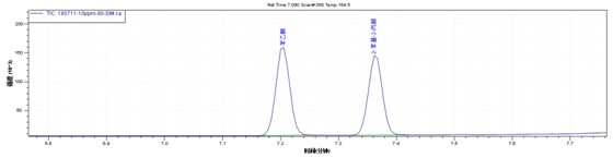 目標物在0.1ppm-2ppm線性良好。取空白鞋材樣品加標,樣品經(jīng)過丙酮超聲萃取。1ppm加標水平下譜圖如下,得到了比較滿意的效果。