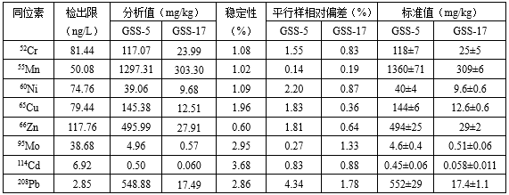 在優(yōu)化的儀器工作參數(shù)下,建立標(biāo)準(zhǔn)溶液工作曲線(線性相關(guān)系數(shù)達(dá)0.999以上),再分別取待測溶液上清液上機(jī)測試。其中:取兩個(gè)平行樣測試結(jié)果的平均值為分析值;對樣品空白溶液平行測定11次,計(jì)算11次測試結(jié)果的SD,以3×SD/k(k為標(biāo)準(zhǔn)溶液工作曲線的斜率)對應(yīng)的值為方法檢出限。取一份GSS-17樣品溶液進(jìn)行穩(wěn)定性考查,即間隔2min采集一個(gè)數(shù)據(jù),連續(xù)采集7組數(shù)據(jù),計(jì)算7組數(shù)據(jù)的RSD,作為穩(wěn)定性指標(biāo)。所得實(shí)驗(yàn)數(shù)據(jù)見表4。
