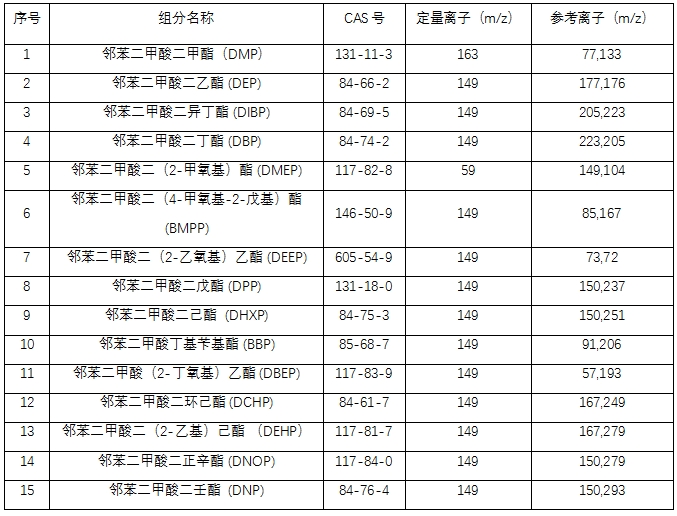 參照現(xiàn)行相關(guān)標準:GB 5009.271—2016《食品安全國家標準 食品中鄰苯二甲酸酯的測定》、GB 9685-2016《食品 安全國家標準 食品接觸材料及制品用添加劑使用標準》、LS/T 6131-2018《糧油檢驗 植物油中鄰苯二甲酸酯類化合物的測定》,本方法對食用油中的15種鄰苯二甲酸酯類物質(zhì)進行檢測,樣品經(jīng)有機溶劑提取、凈化、定容后,用GC-MS 6800氣相色譜質(zhì)譜聯(lián)用儀進行準確的定性和定量測定。