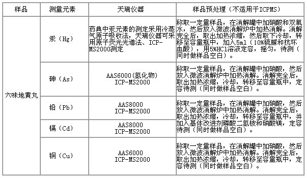 天瑞儀器參考《中華人民共和國藥典》,采用原子吸收光譜儀(AAS6000;AAS8000)、原子熒光光譜儀(AFS200系列)、電感耦合等離子體質(zhì)譜儀(ICP-MS2000),對六味地黃丸中鎘、鉛、銅、砷、砷、汞等重金屬的測定進行研究,測試結(jié)果準(zhǔn)確度高,重復(fù)性好。