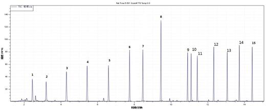 1.正己烷 2.苯 3.三氯乙烯 4.甲苯 5.辛烯 6.乙酸丁酯 7.乙苯 8.對(duì)(間)二甲苯 9.鄰二甲苯 10.苯乙烯 11.壬烷 12.異辛醇 13.十一烷 14.十四烷 15.十六烷