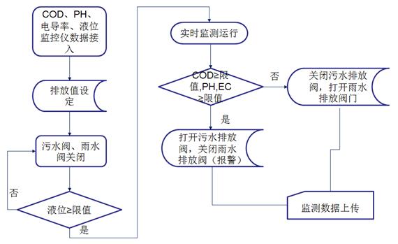 監(jiān)測系統(tǒng)控制采樣單元將水樣導入監(jiān)測室,并啟動監(jiān)測水質的COD、pH、電導率等常規(guī)參數(shù)。達標雨水通過電控閥門排入市政雨水管網(wǎng),一旦超標電控閥門關閉,禁止雨水排入市政雨水管網(wǎng),并通過水泵將超標雨水泵入企業(yè)污水處理系統(tǒng)處理,達標后排放至市政污水管網(wǎng)。同時所有監(jiān)測數(shù)據(jù)經(jīng)由數(shù)據(jù)采集單元將數(shù)據(jù)統(tǒng)計后,由傳輸設備傳輸至企業(yè)監(jiān)測中心或環(huán)保局,由此完成對雨水排放自動、實時、連續(xù)監(jiān)控。