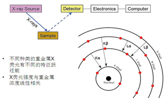 X射線熒光光譜技術(shù)(XRF)的原理見圖3所示,可以直接檢測固體或液體樣品中ppm量級(jí)的元素成分。采用富集后再檢測的辦法,使得XRF技術(shù)對空氣顆粒物中的重金屬成分的檢測限優(yōu)于0.001ug/m3。而常規(guī)實(shí)驗(yàn)室的檢測技術(shù),由于預(yù)處理消解過程中需要將微克量級(jí)的樣品溶解到幾十克的液體中,而使得濃度被稀釋百萬倍,從而多數(shù)儀器(譬如ICP-AES、或原子吸收光譜儀)無法檢出元素含量低于10ug/m3量級(jí)的空氣顆粒物樣品。