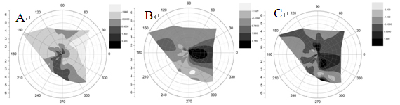 圖6 EHM-X200大氣重金屬監(jiān)測儀監(jiān)測數(shù)據(jù)PM2.5中元素主成分分析得到的各組分與風(fēng)向關(guān)系圖。圖A是組分1(工業(yè)、生活燃料燃燒)的濃度與風(fēng)向關(guān)系圖,從圖中可以看出組分1主要來源于監(jiān)測點(diǎn)位的西南方向(深色區(qū)域);圖B是組分2(冶金工業(yè)廢氣)的濃度與風(fēng)向關(guān)系圖,從圖中可以看出組分2來源于監(jiān)測點(diǎn)自身范圍內(nèi)(深色區(qū)域);圖C是組分3(揚(yáng)塵)的濃度與風(fēng)向關(guān)系圖,從圖中可以看出組分3主要來源于監(jiān)測點(diǎn)位的東方及北方(深色區(qū)域)。圖中顏色深淺由淺到深代表污染的程度由小到大。