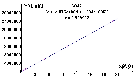 按照硫酸根各濃度點(diǎn)依次進(jìn)樣,計算其峰面積,以濃度和峰面積繪制標(biāo)準(zhǔn)曲線,線性相關(guān)系數(shù)為0.99996,結(jié)果詳見圖1。