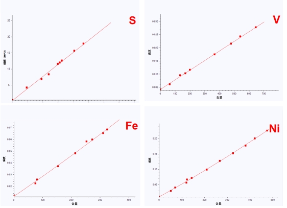 上圖為使用EDX 6000C能量色散熒光光譜儀測量不同含量石油焦二次標(biāo)樣,建立S、V、Fe、Ni元素含量與強度的一次或二次校正工作曲線。由圖可知,S、V、Fe、Ni組分含量與強度具有非常好的線性關(guān)系。