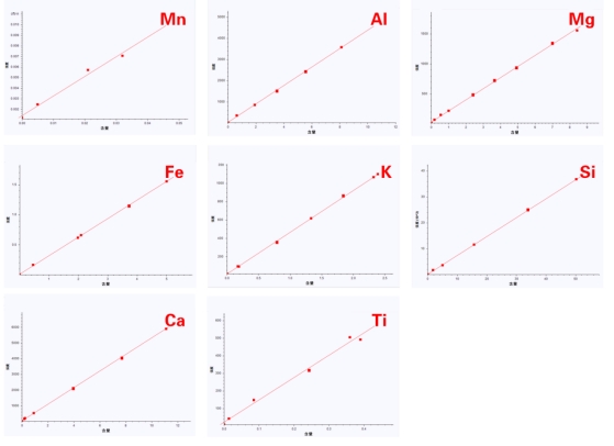 設(shè)定適當(dāng)?shù)臏y量條件,使用X射線熒光光譜儀掃描一系列含量已知的石墨標(biāo)準(zhǔn)物質(zhì)或石墨二次標(biāo)樣,該系列樣品中需關(guān)注元素Mg、Al、Si、K、Ca、Ti、Mn、Fe等元素含量與強度的一次線性校正工作曲線。然后,對未知石墨樣品進(jìn)行測量。